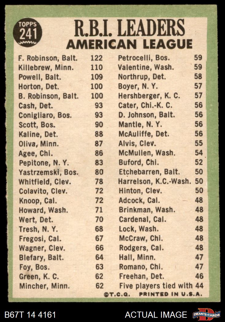 1967 Topps #241 - Harmon Killebrew / Boog Powell / Frank Robinson AL RBI Leaders 5 - EX