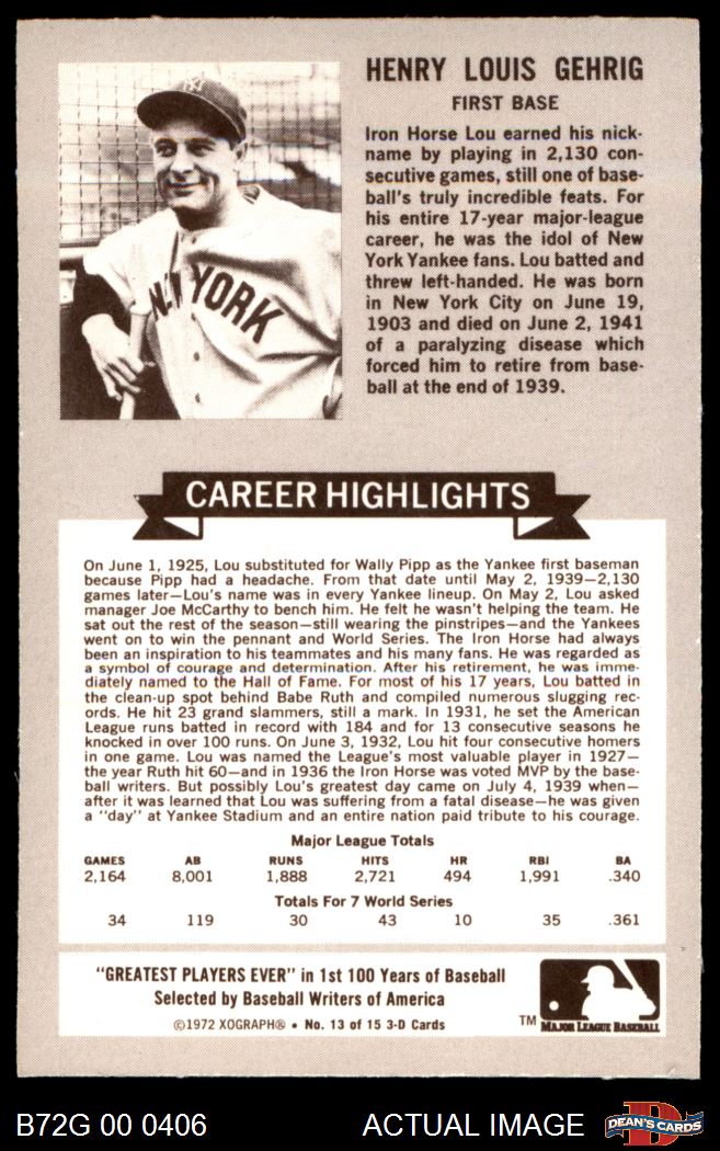 1972 Kellogg All Time Greats #13 Lou Gehrig 8 - NM/MT