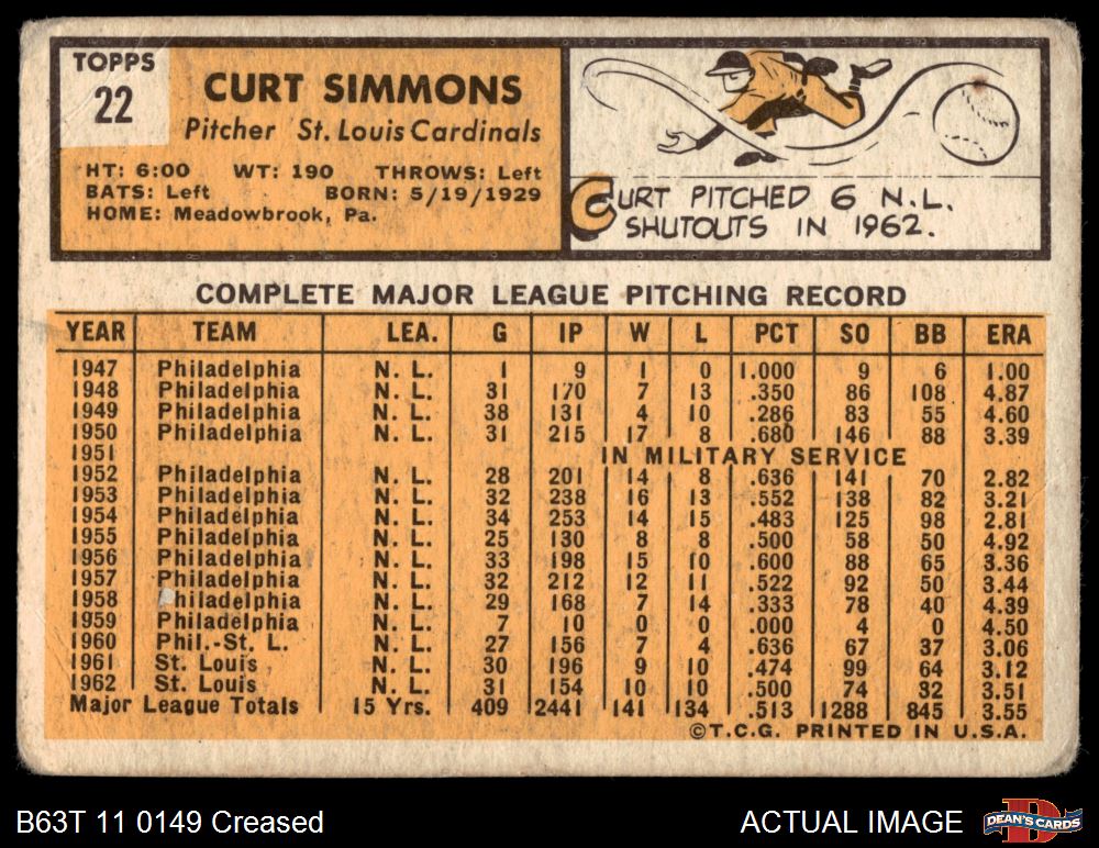 1963 Topps #22 Curt Simmons Front Thumbnail
