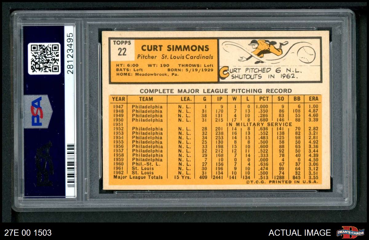 1963 Topps #22 Curt Simmons PSA 6 - EX/MT