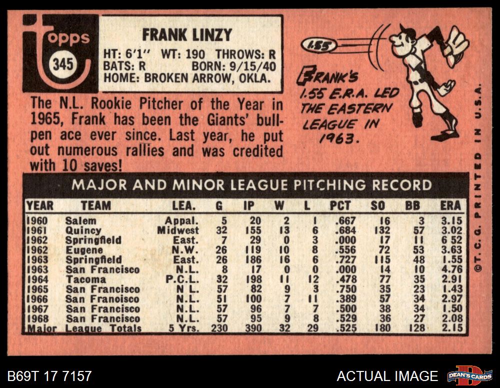 1969 Topps #345 Frank Linzy 3 - VG
