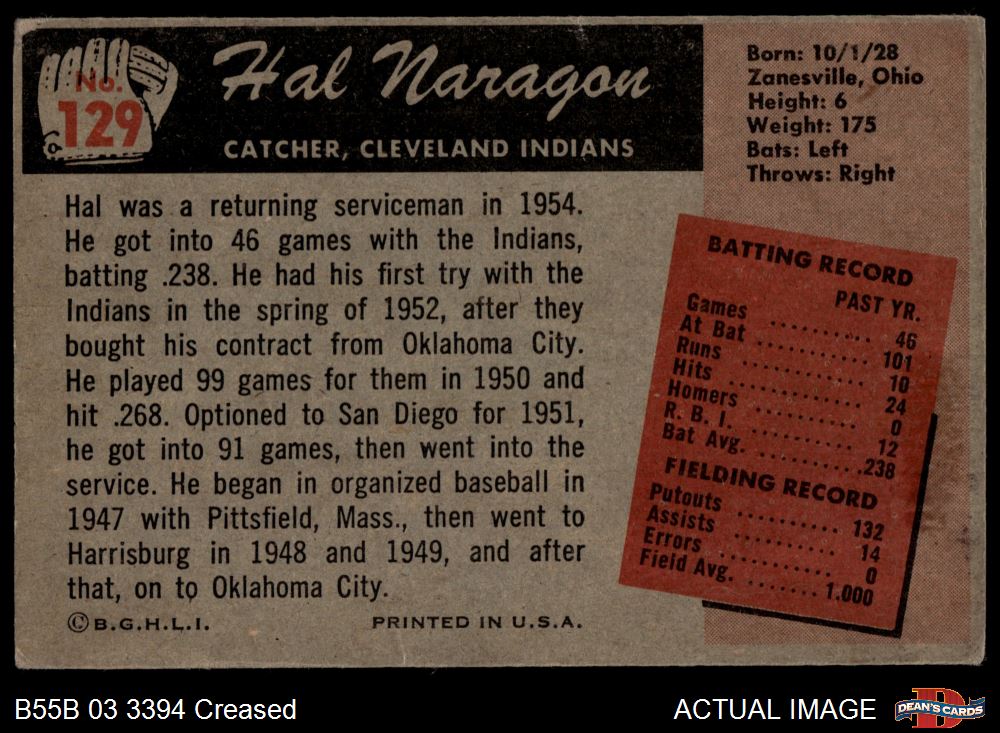 1955 Bowman #129 Hal Naragon 3 - VG