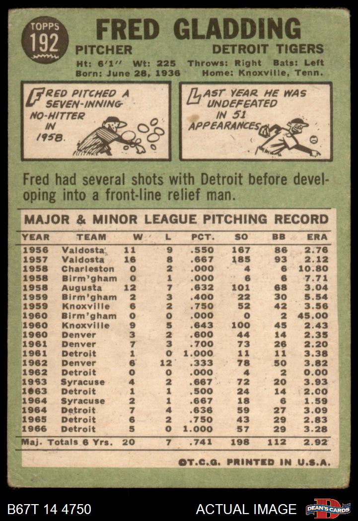 1967 Topps #192 Fred Gladding 1 - POOR