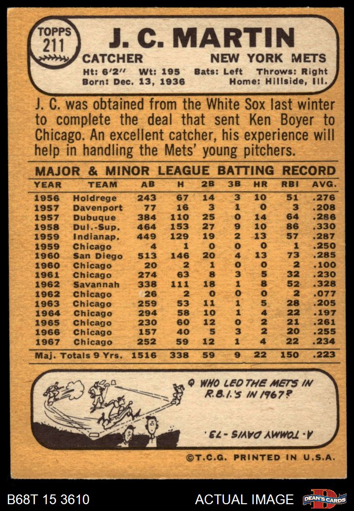 1968 Topps #211 J.C. Martin 7 - NM