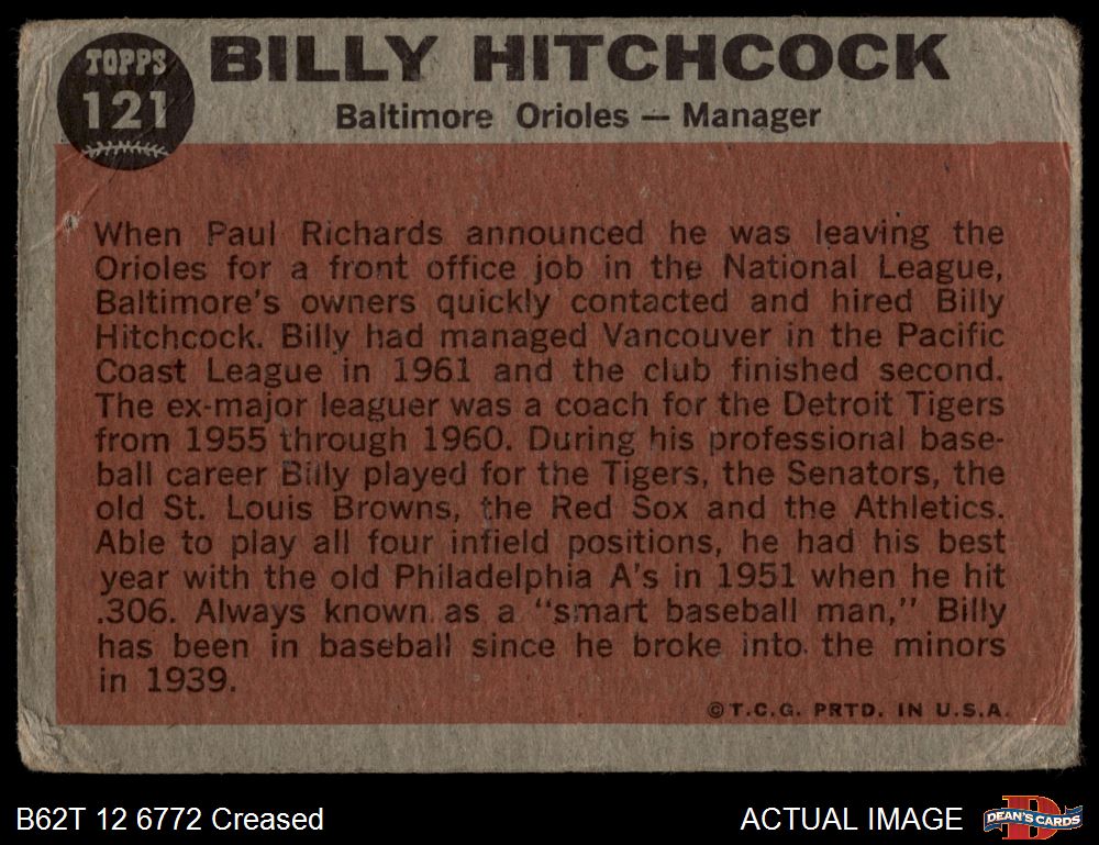 1962 Topps #121 GRN Billy Hitchcock