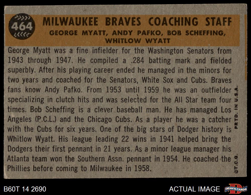 1960 Topps #464 - Bob Scheffing / Whitlow Wyatt / Andy Pafko / George Myatt Braves Coaches 2 - GOOD