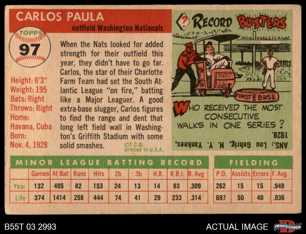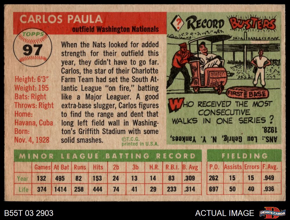 1955 Topps #97 Carlos Paula 3 - VG
