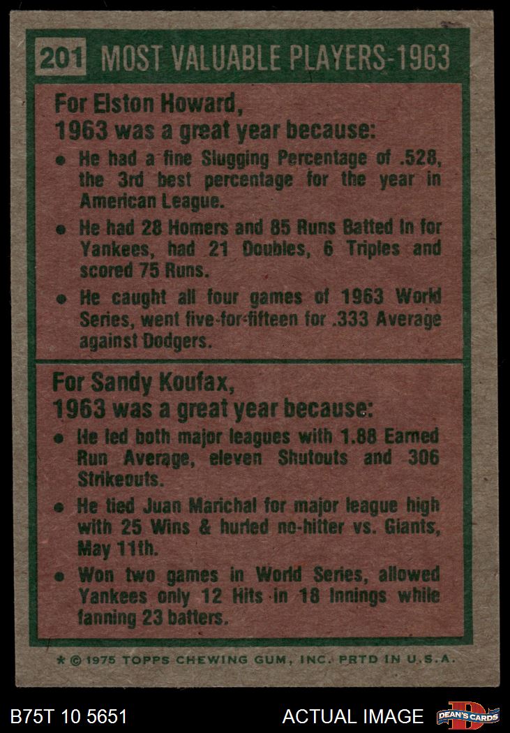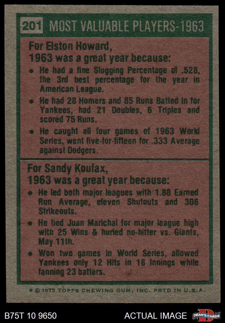 1975 Topps #201 - Sandy Koufax / Elston Howard 1963 MVPs 7 - NM