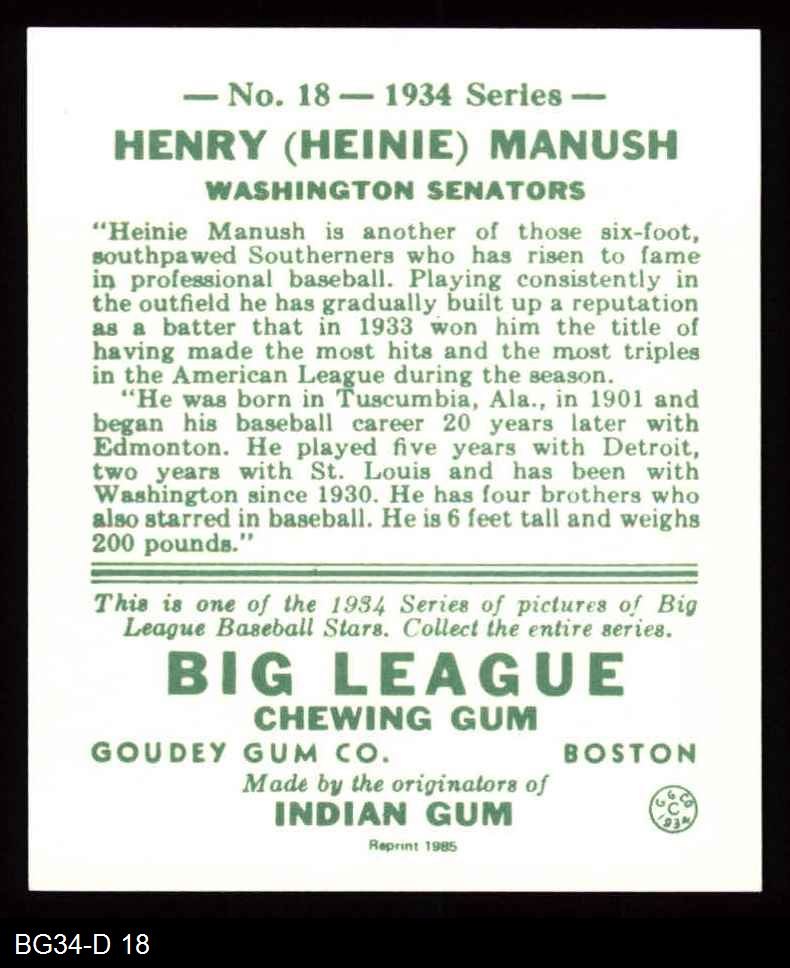 1934 Goudey Reprint #18 Heinie Manush 8 - NM/MT