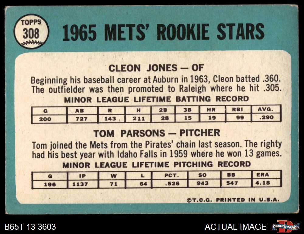 1965 Topps #308 - Cleon Jones / Tom Parsons Mets Rookies 2 - GOOD