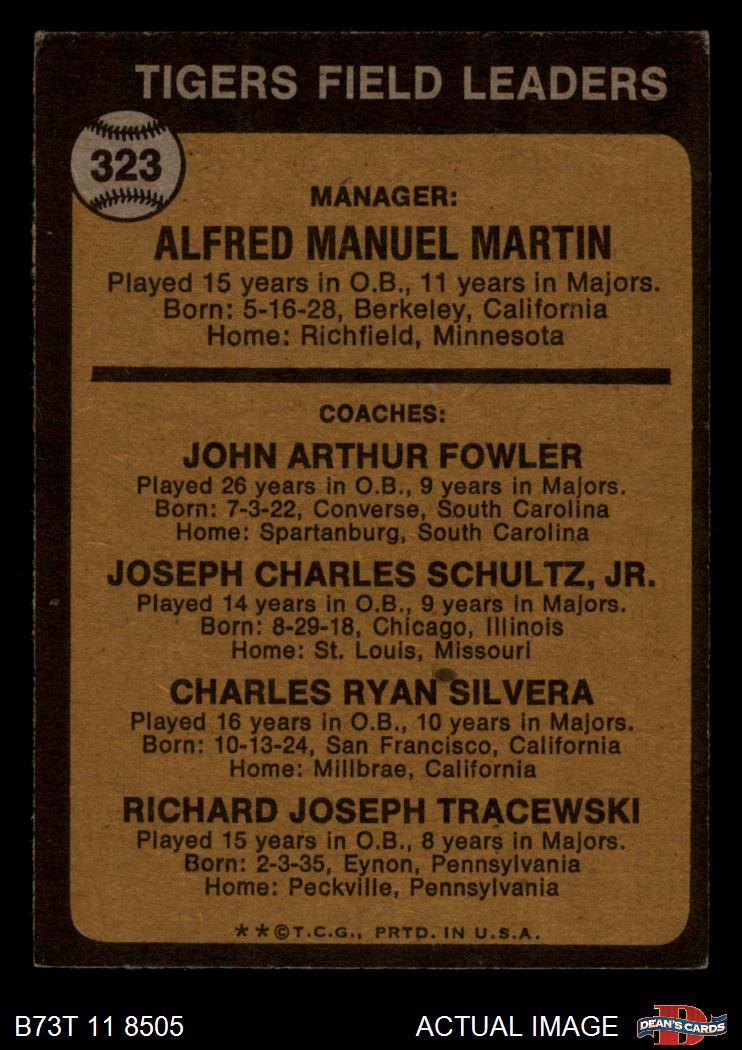 1973 Topps #323 - Billy Martin / Art Fowler / Joe Schultz / Charlie Silvera / Dick Tracewski Tigers Leaders 3 - VG