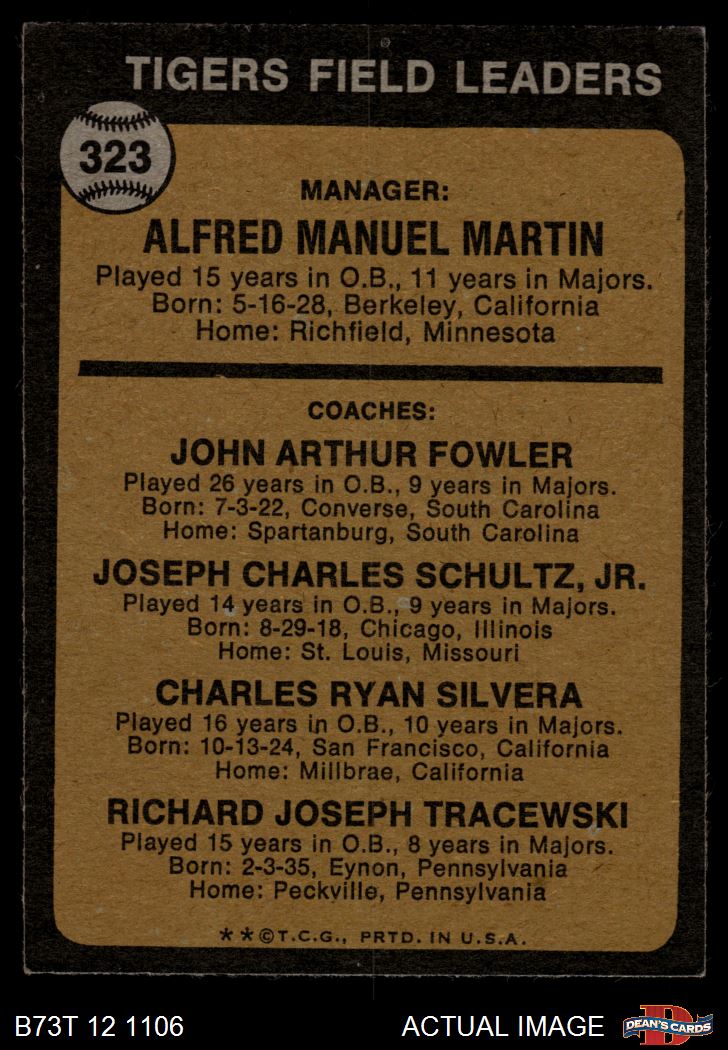 1973 Topps #323 - Billy Martin / Art Fowler / Joe Schultz / Charlie Silvera / Dick Tracewski Tigers Leaders 4 - VG/EX