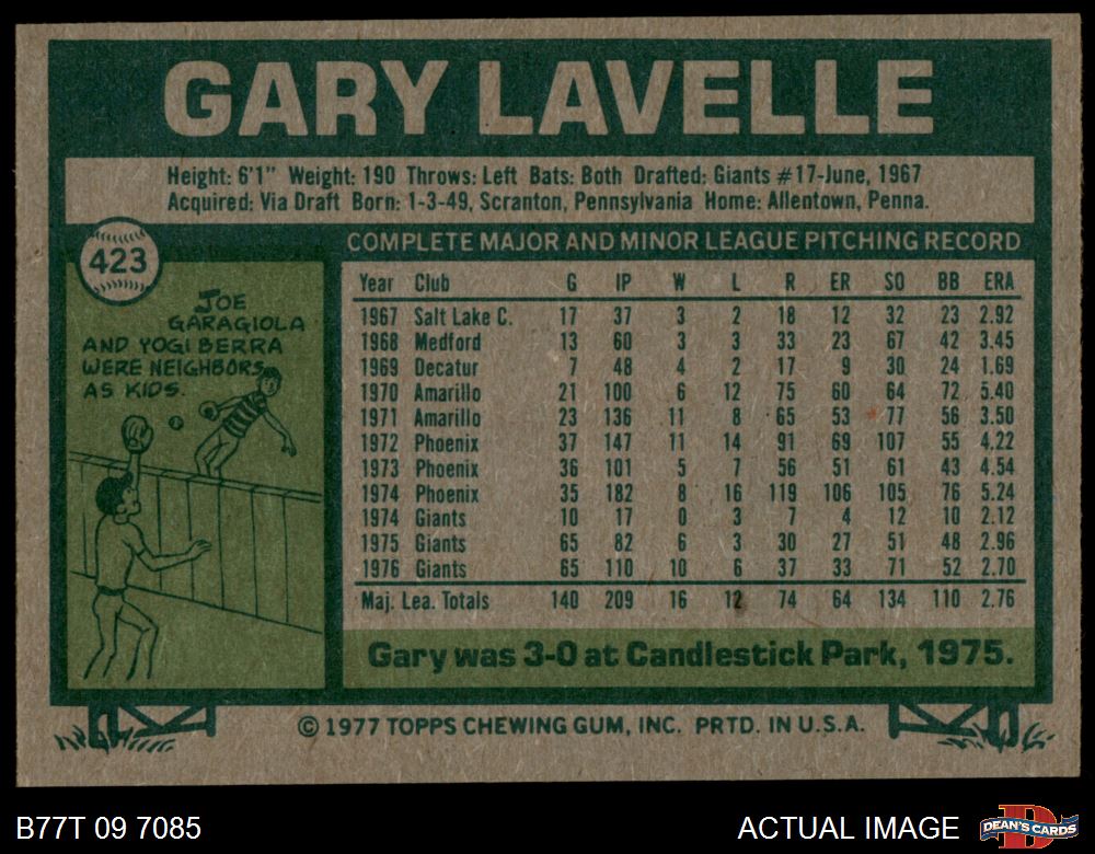 1977 Topps #423 Gary Lavelle 4 - VG/EX