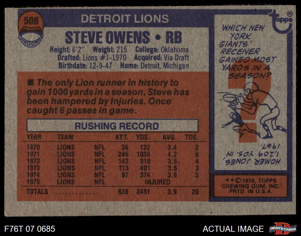 1976 Topps #508 Steve Owens 4 - VG/EX