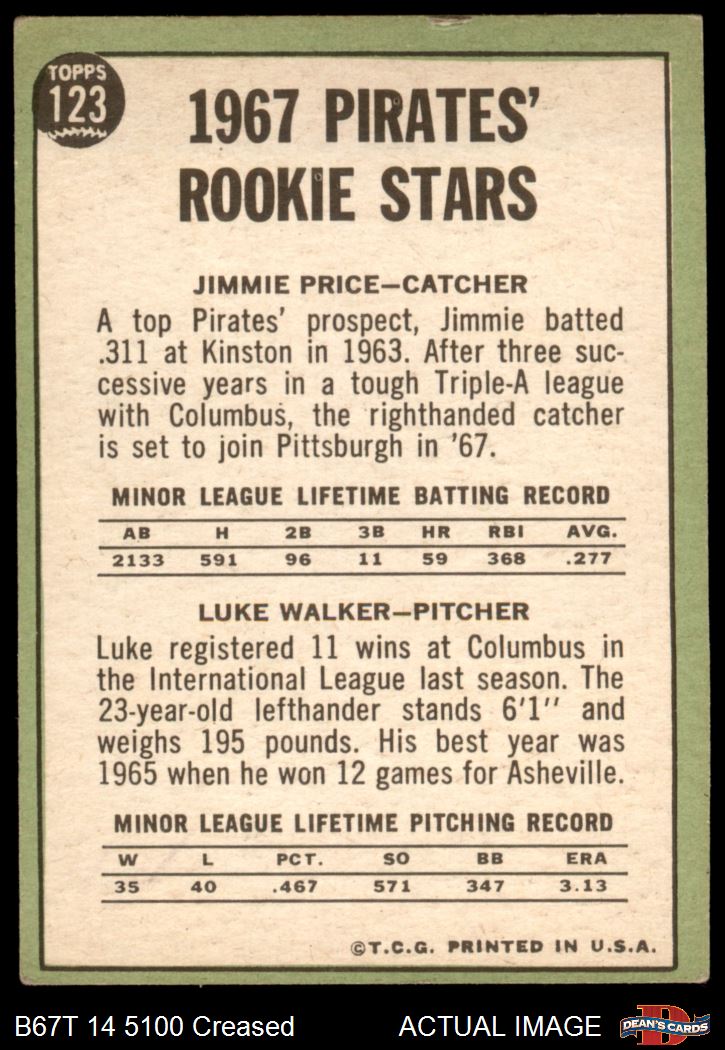 1967 Topps #123 - Luke Walker / Jim Price Pirates Rookies 2 - GOOD