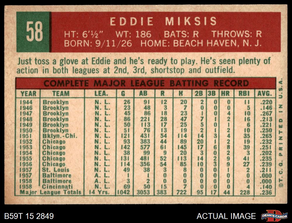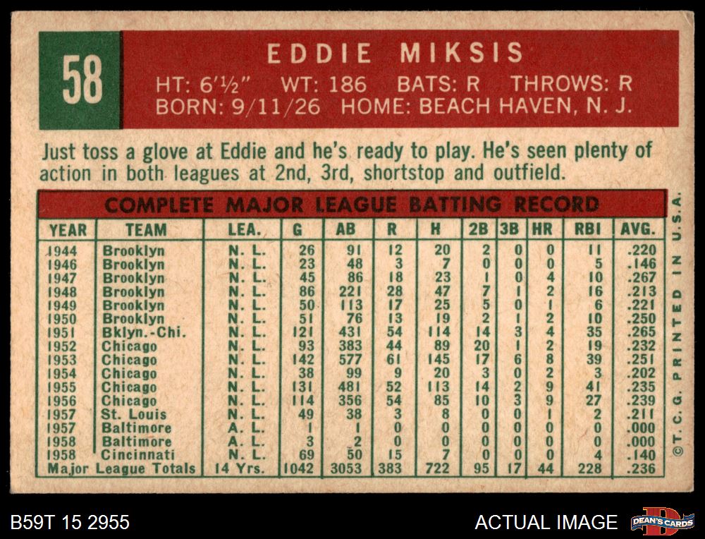 1959 Topps #58 Eddie Miksis 4 - VG/EX