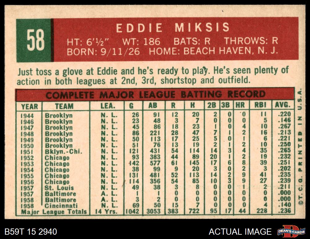 1959 Topps #58 Eddie Miksis 5 - EX