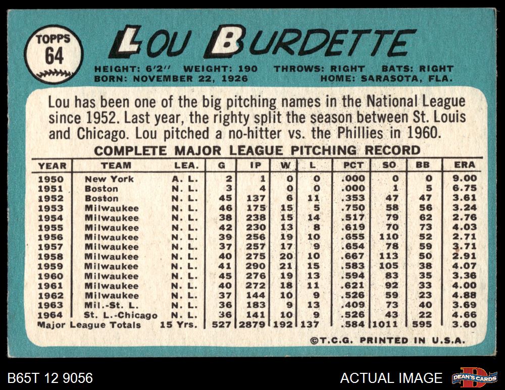 1965 Topps #64 Lew Burdette 4 - VG/EX