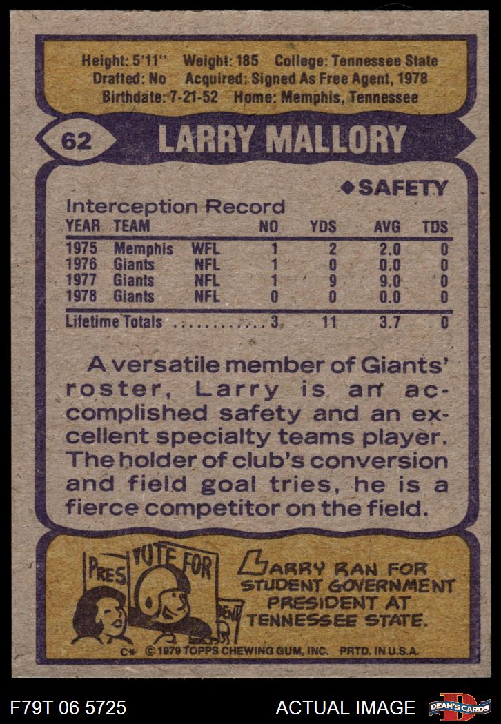 1979 Topps #62 Larry Mallory 8 - NM/MT