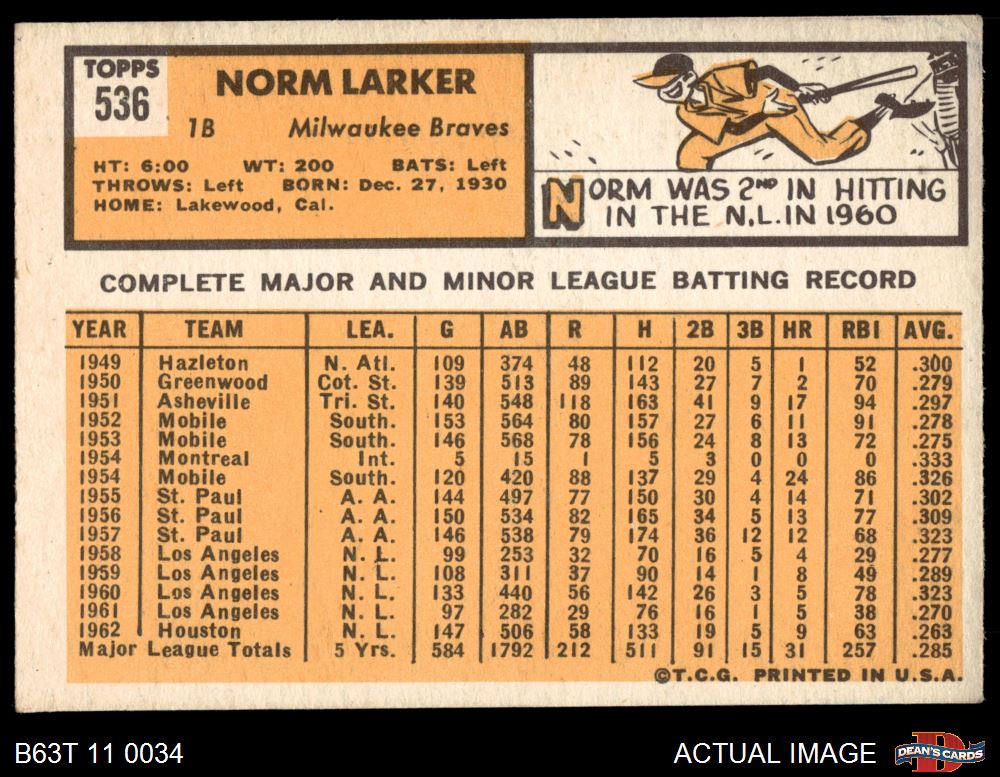 1963 Topps #536 Norm Larker 4 - VG/EX