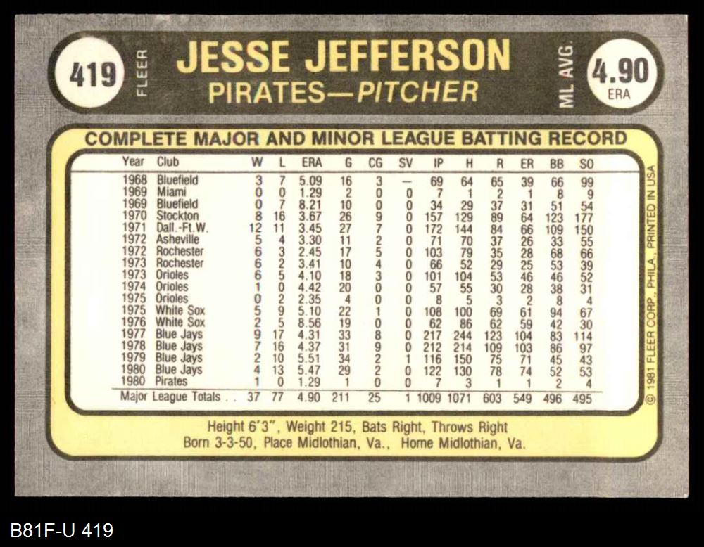 1981 Fleer #419 A Jesse Jefferson 8 - NM/MT