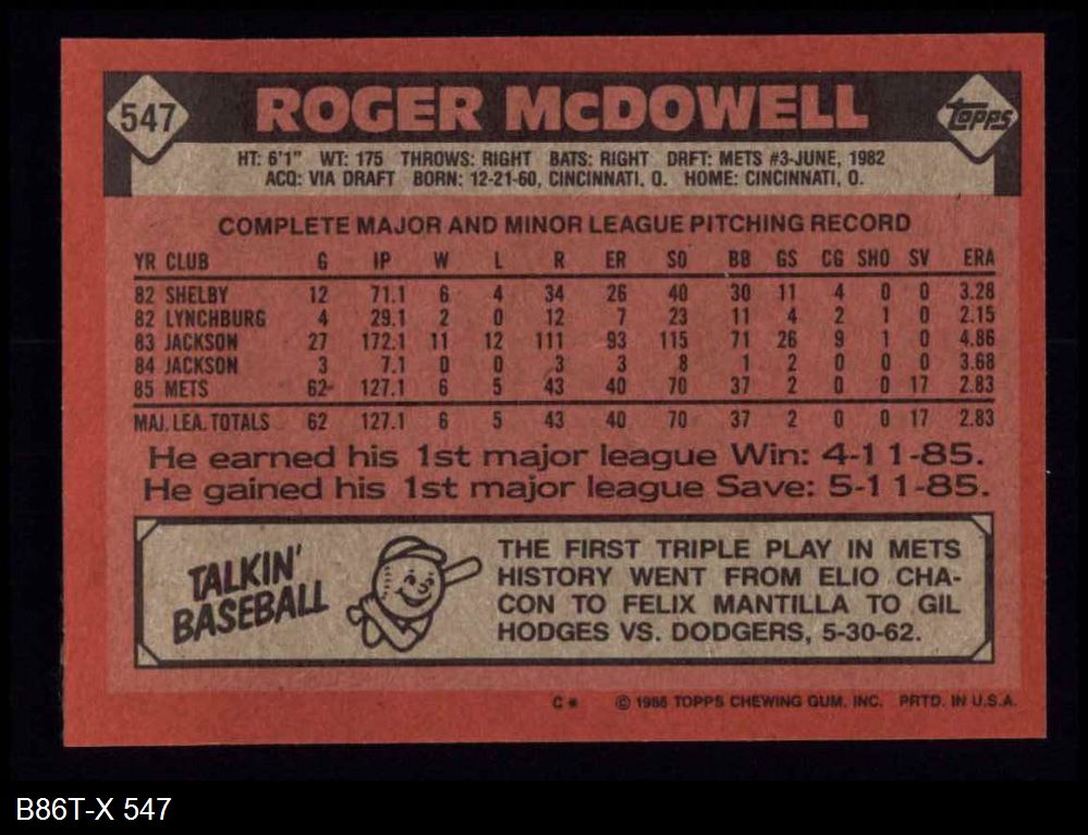 1986 Topps #547 Roger McDowell 8 - NM/MT