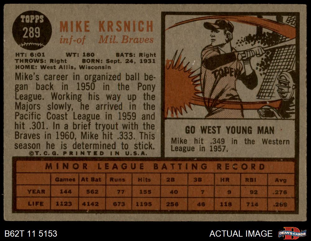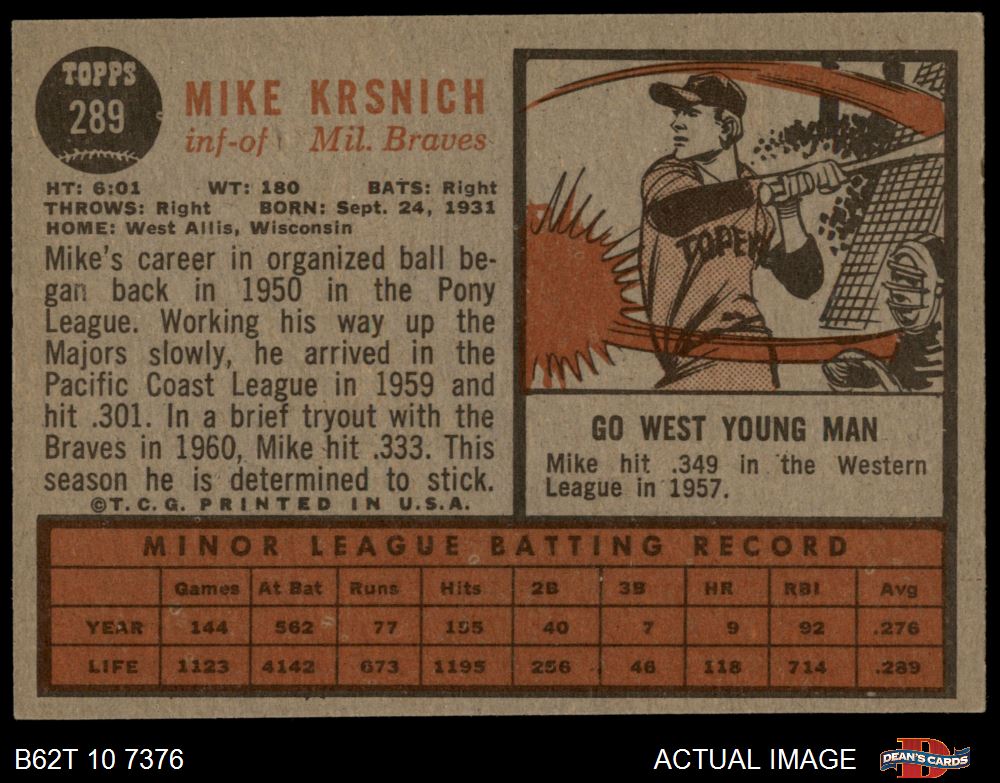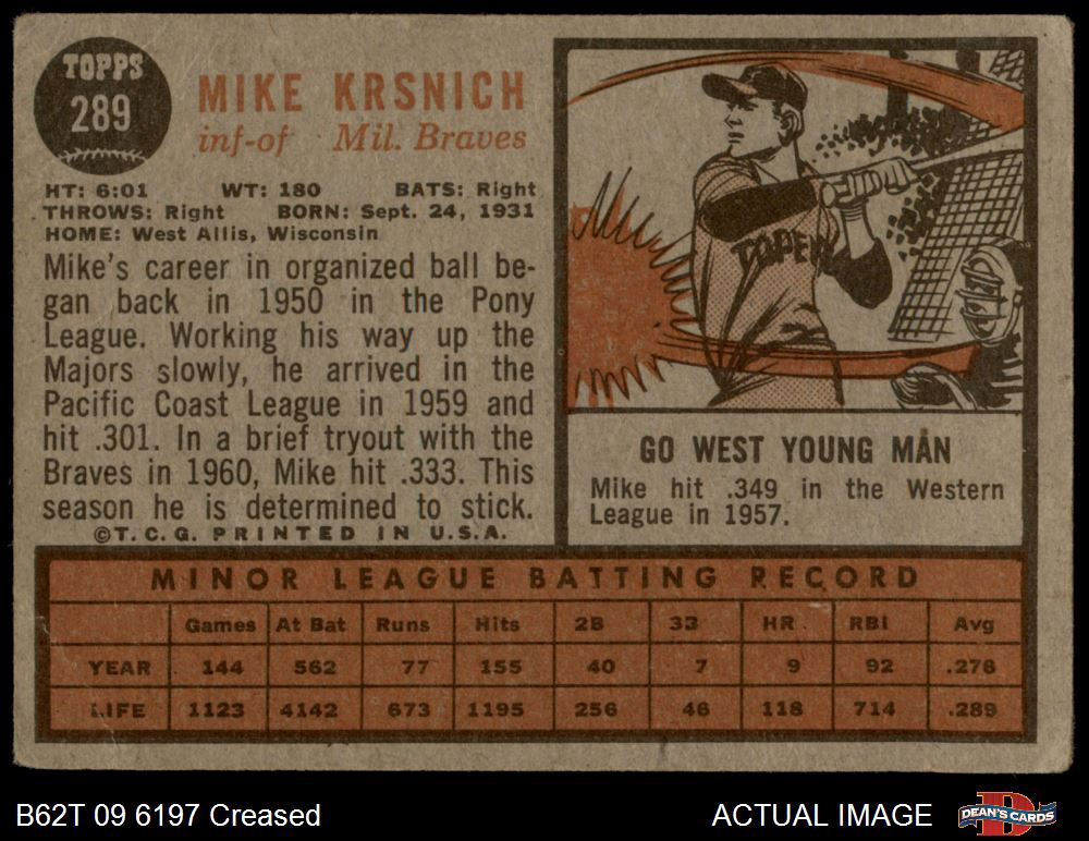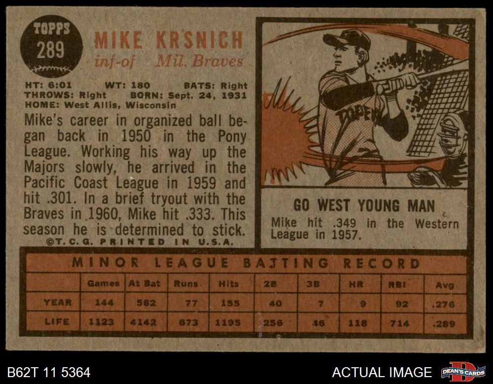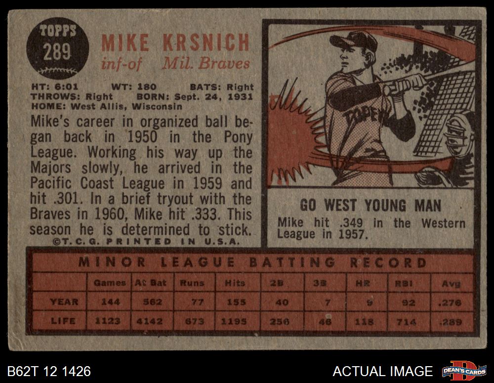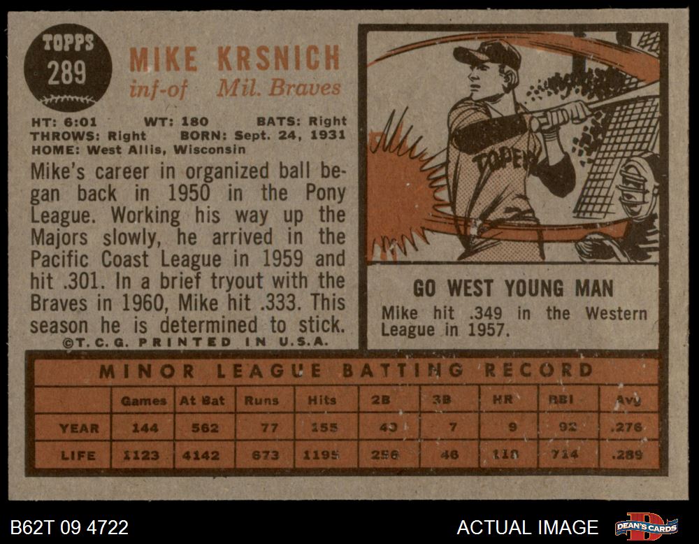 1962 Topps #289 Mike Krsnich