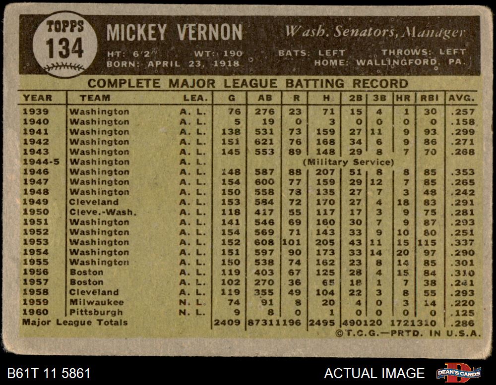 1961 Topps #134 Mickey Vernon 1 - POOR