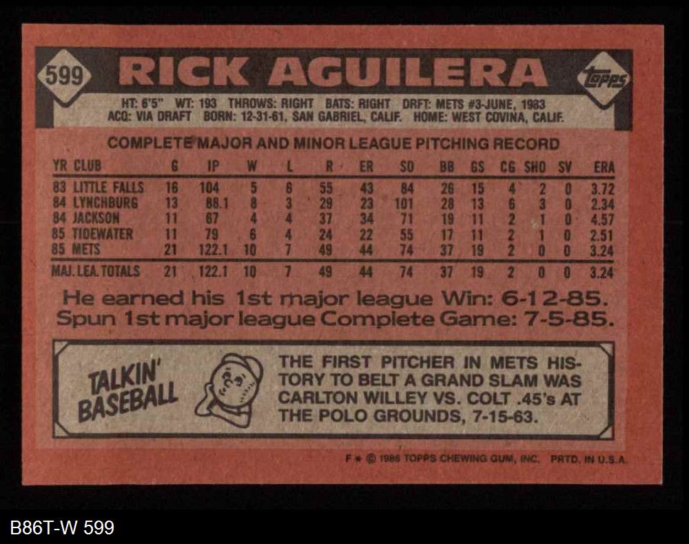 1986 Topps #599 Rick Aguilera