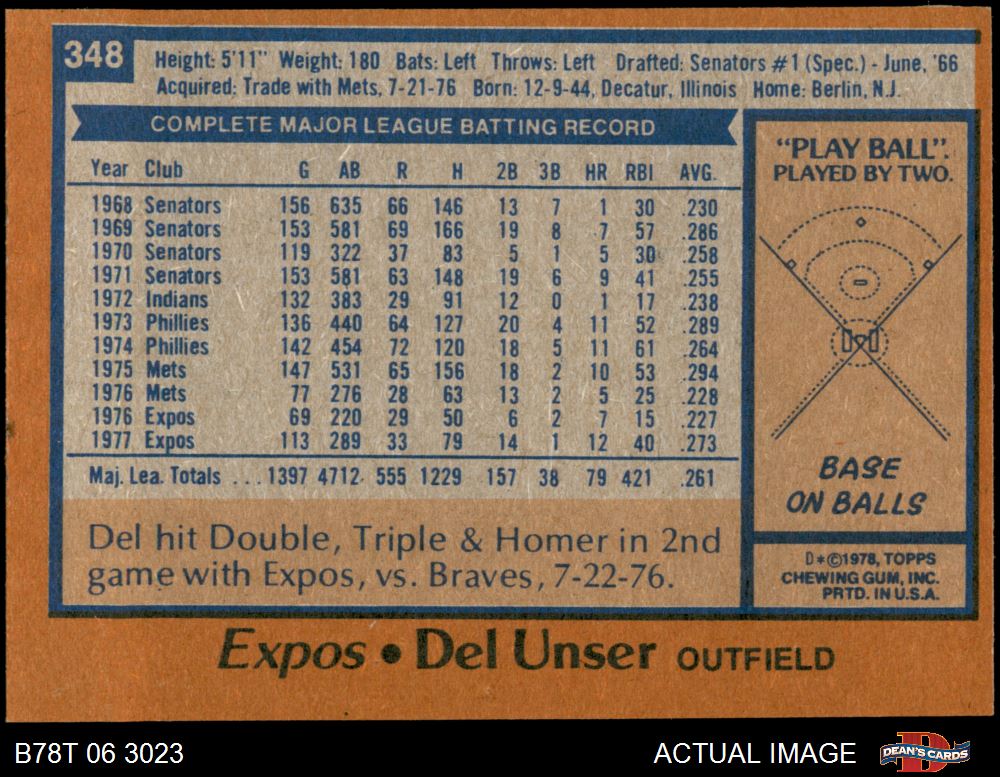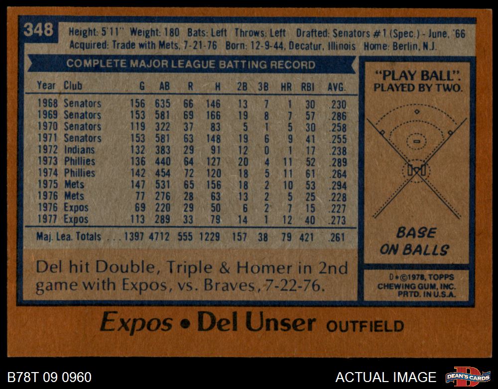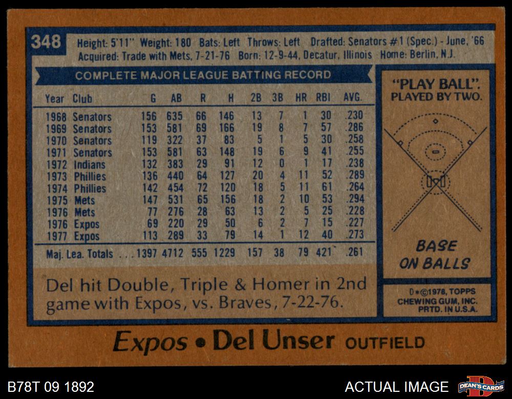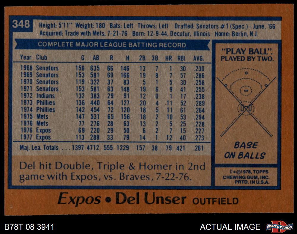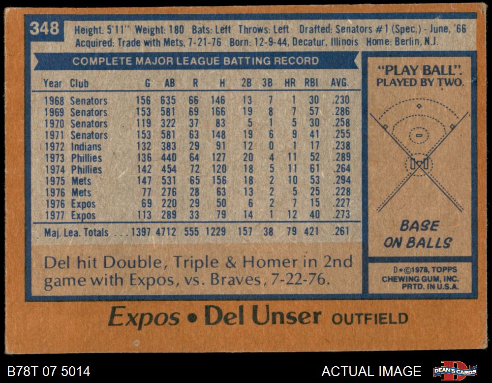 1978 Topps #348 Del Unser 4 - VG/EX