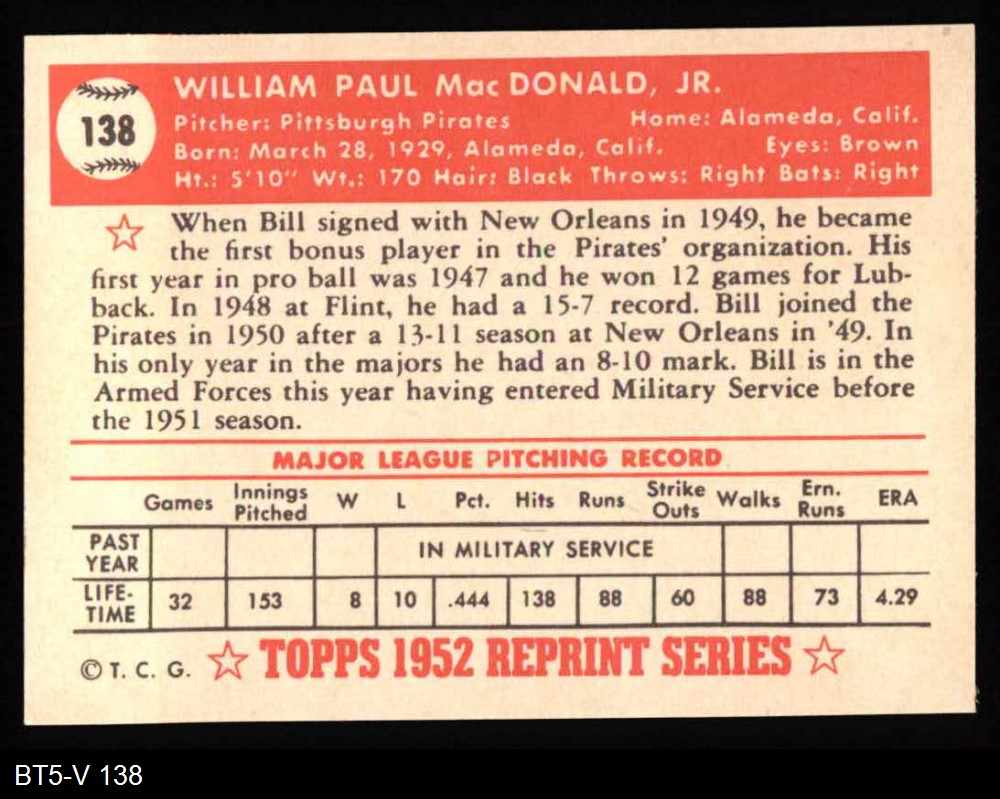 1952 Topps REPRINT #138 Bill MacDonald