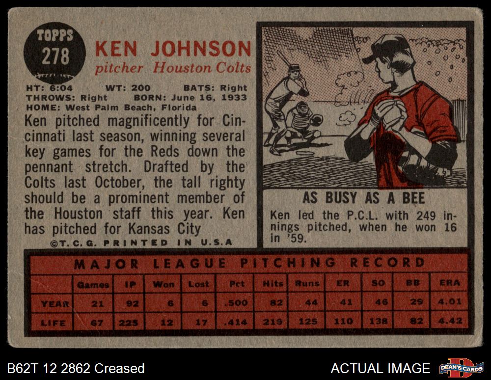 1962 Topps #278 Ken Johnson 1.5 - FAIR