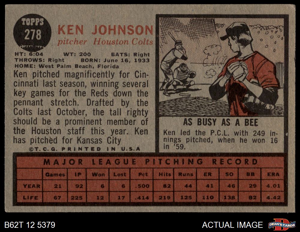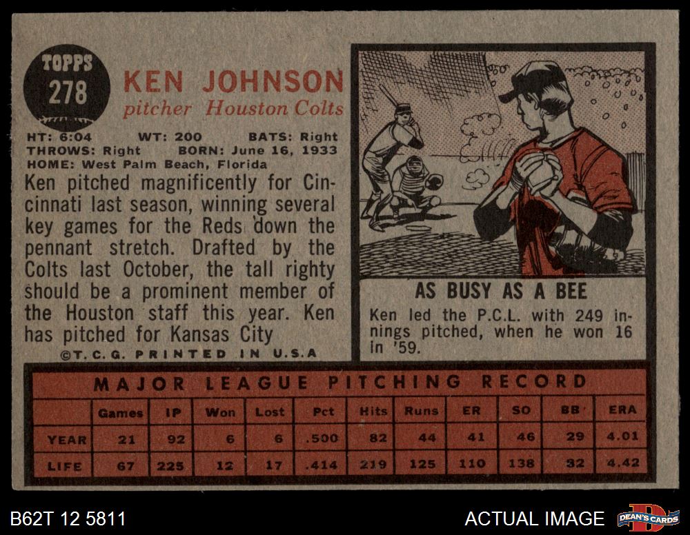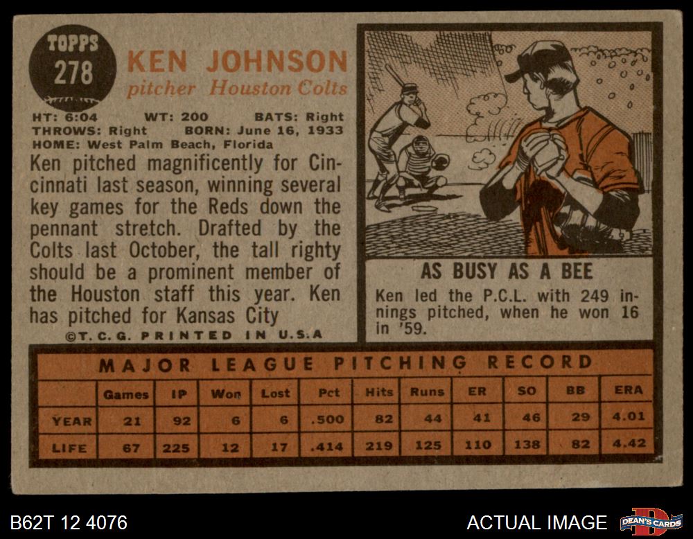 1962 Topps #278 Ken Johnson 3 - VG