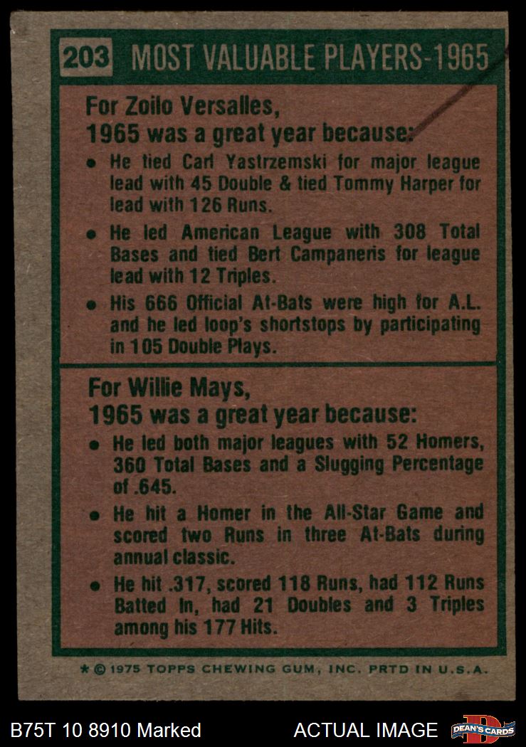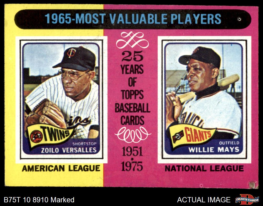 1975 Topps #203  -  Willie Mays / Zoilo Versalles 1965 MVPs Front Thumbnail