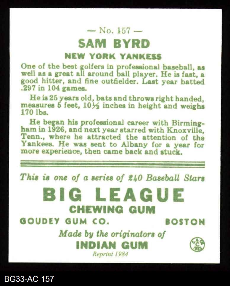1933 Goudey Reprint #157 Sammy Byrd