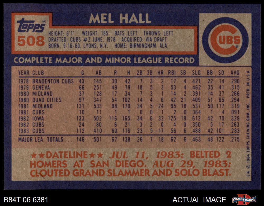 1984 Topps #508 Mel Hall 8 - NM/MT
