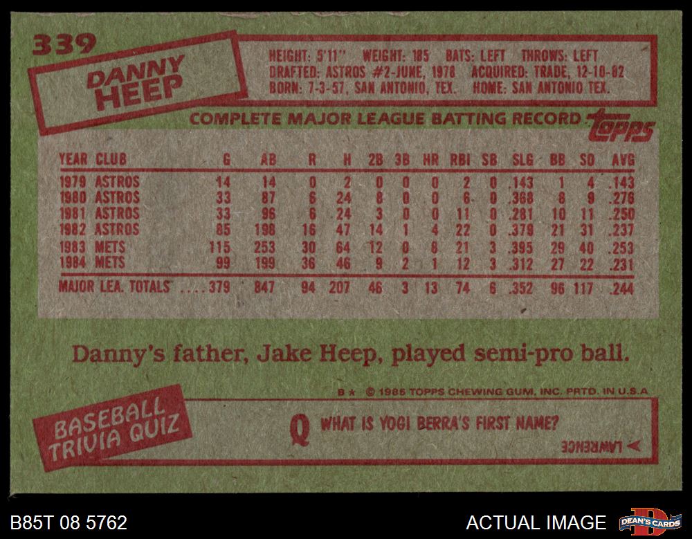 1985 Topps #339 Danny Heep 8 - NM/MT