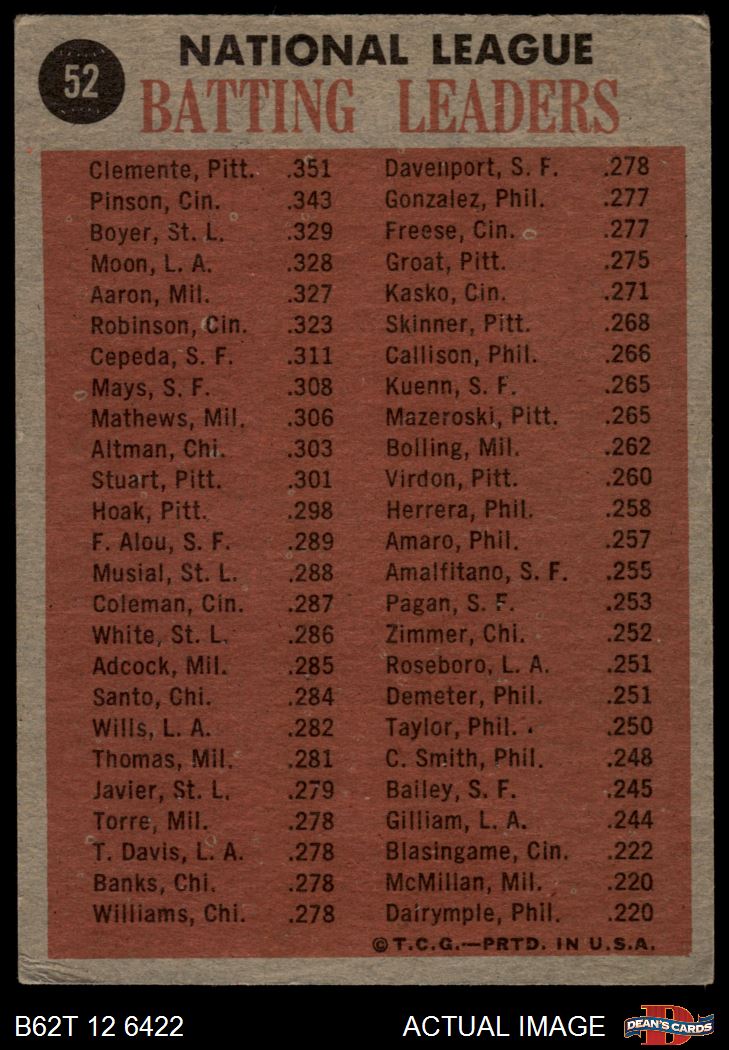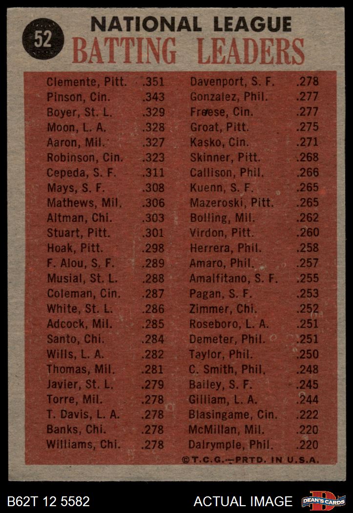 1962 Topps #52 NL Batting Leaders