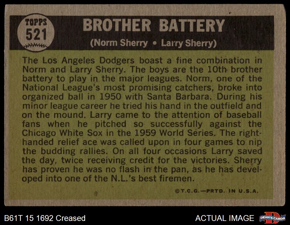 1961 Topps #521 - Norm Sherry / Larry Sherry Brother Battery 2 - GOOD