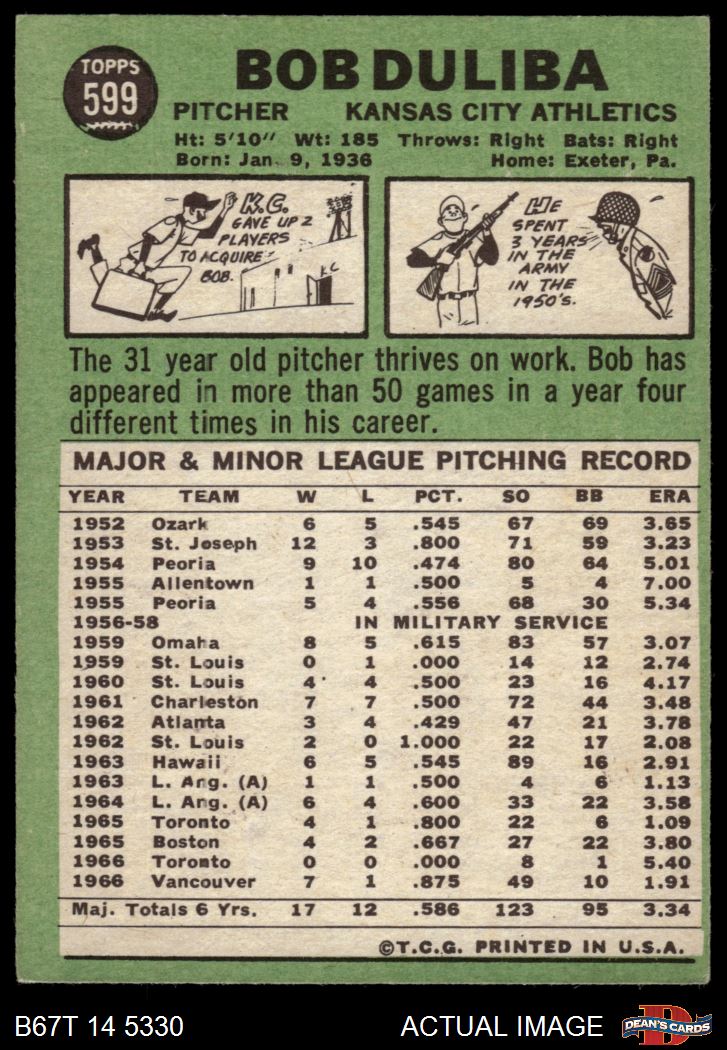 1967 Topps #599 Bob Duliba 2 - GOOD