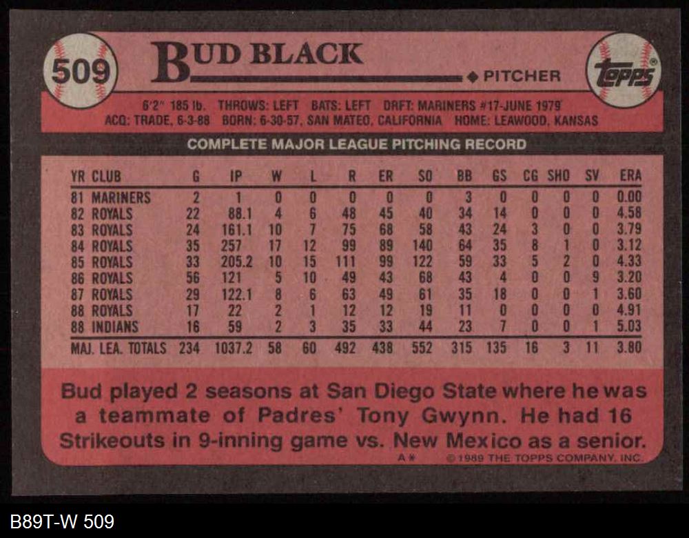 1989 Topps #509 Bud Black 8 - NM/MT