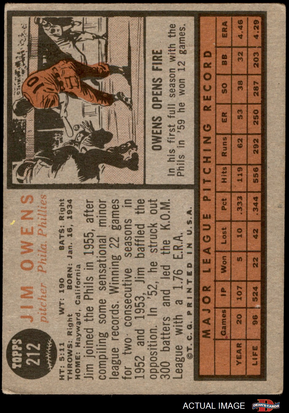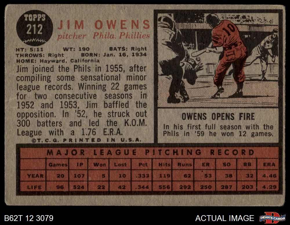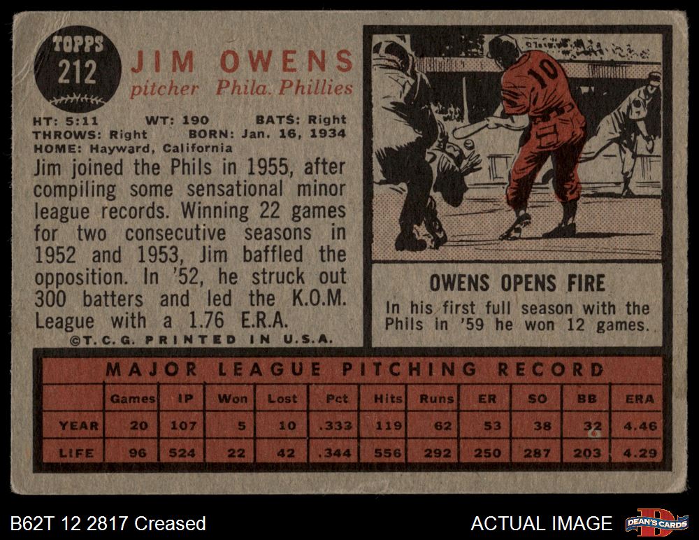1962 Topps #212 Jim Owens 1.5 - FAIR