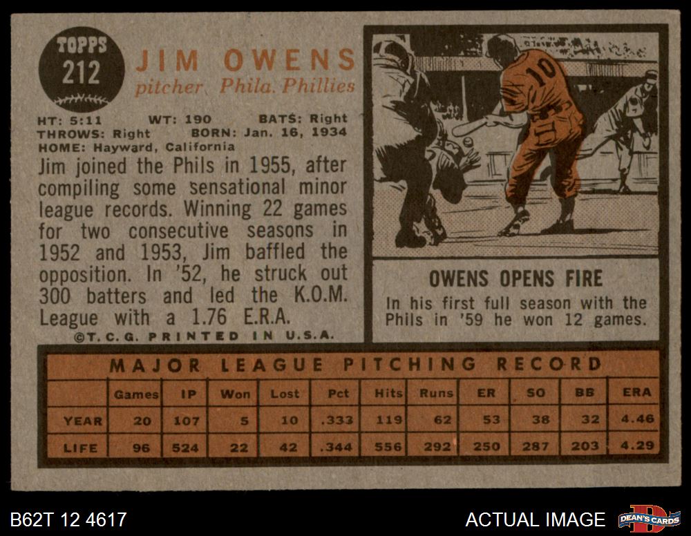 1962 Topps #212 Jim Owens 4 - VG/EX