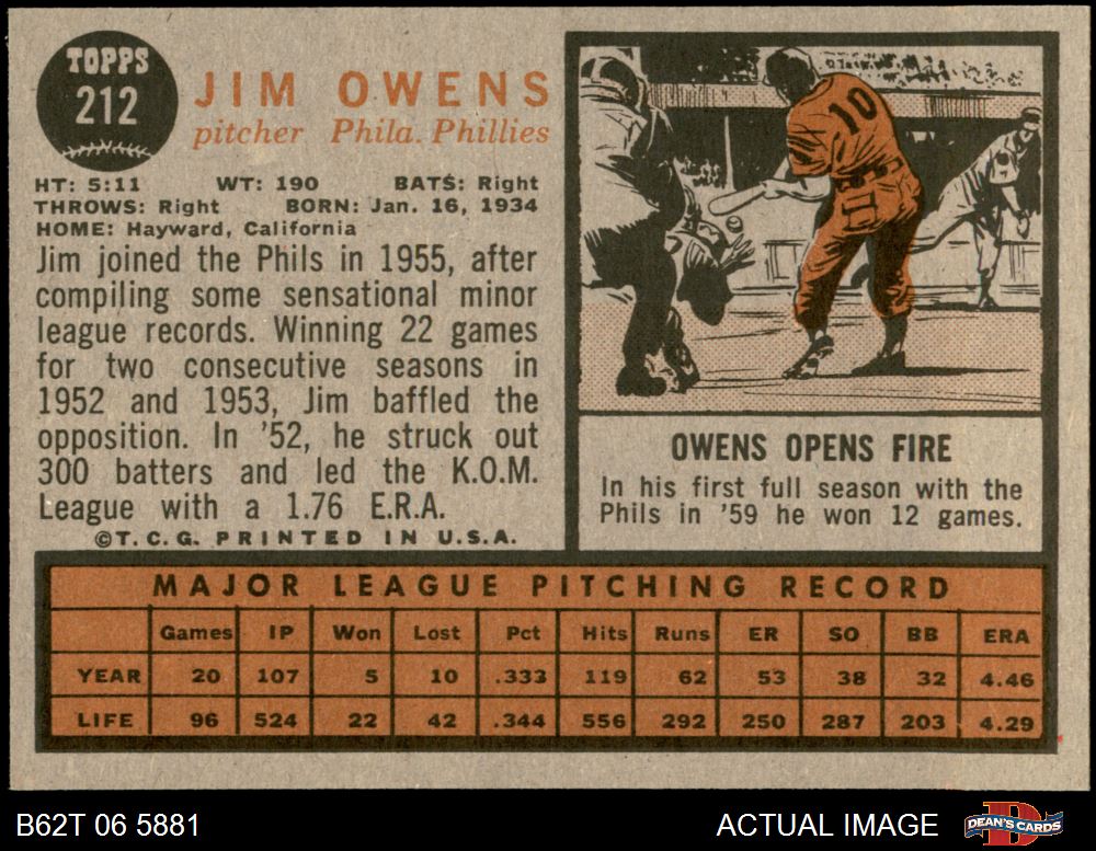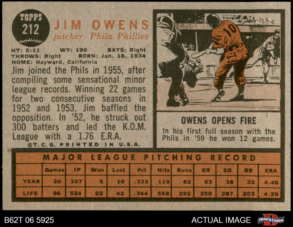 1962 Topps #212 Jim Owens 8 - NM/MT
