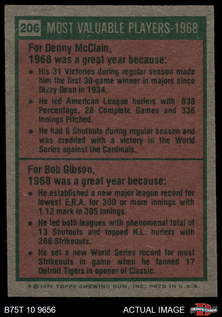 1975 Topps #206 - Denny McLain / Bob Gibson 1968 MVPs 6.5 - EX/MT+