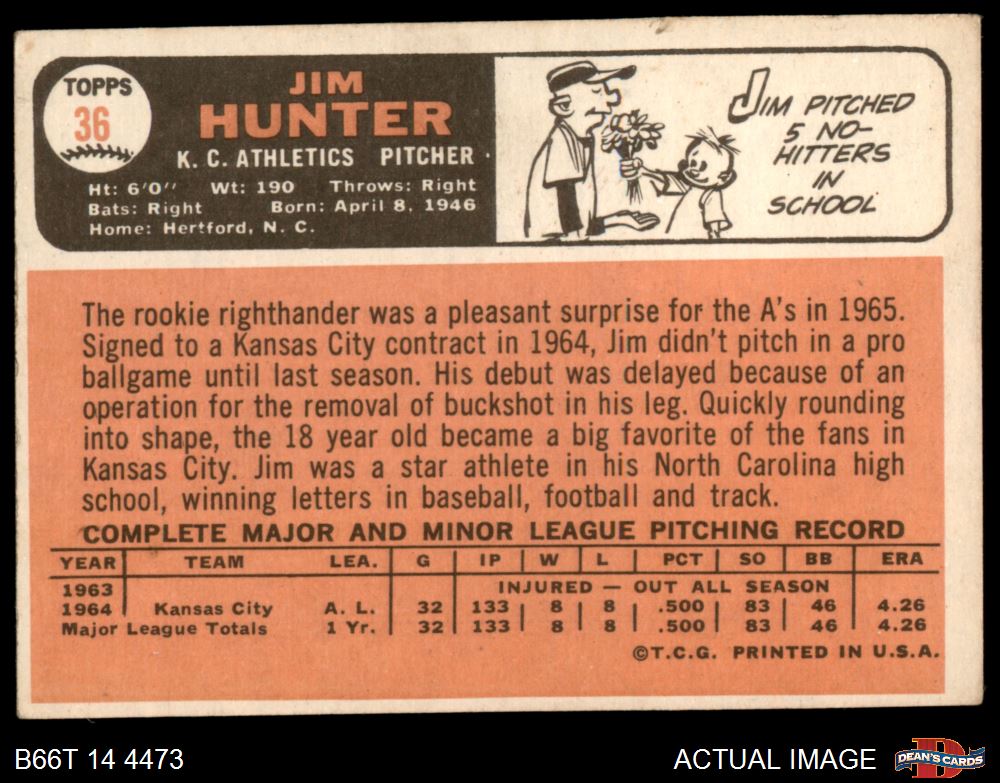1966 Topps #36 Catfish Hunter 2 - GOOD