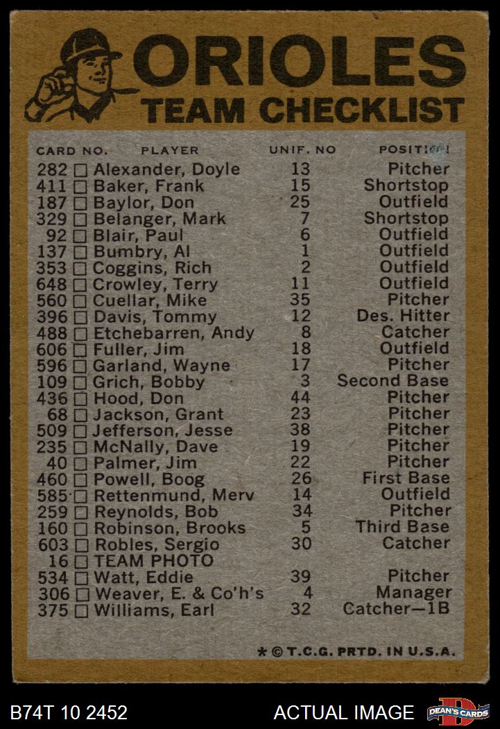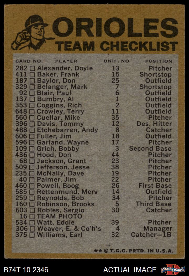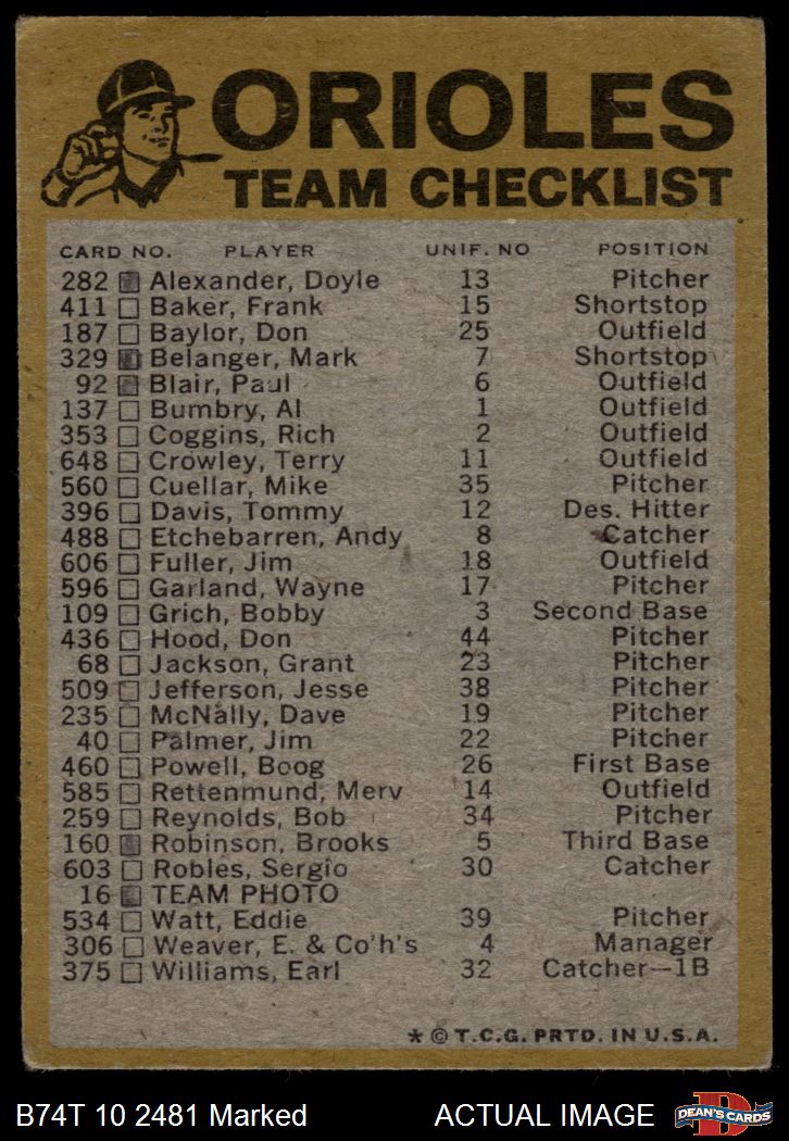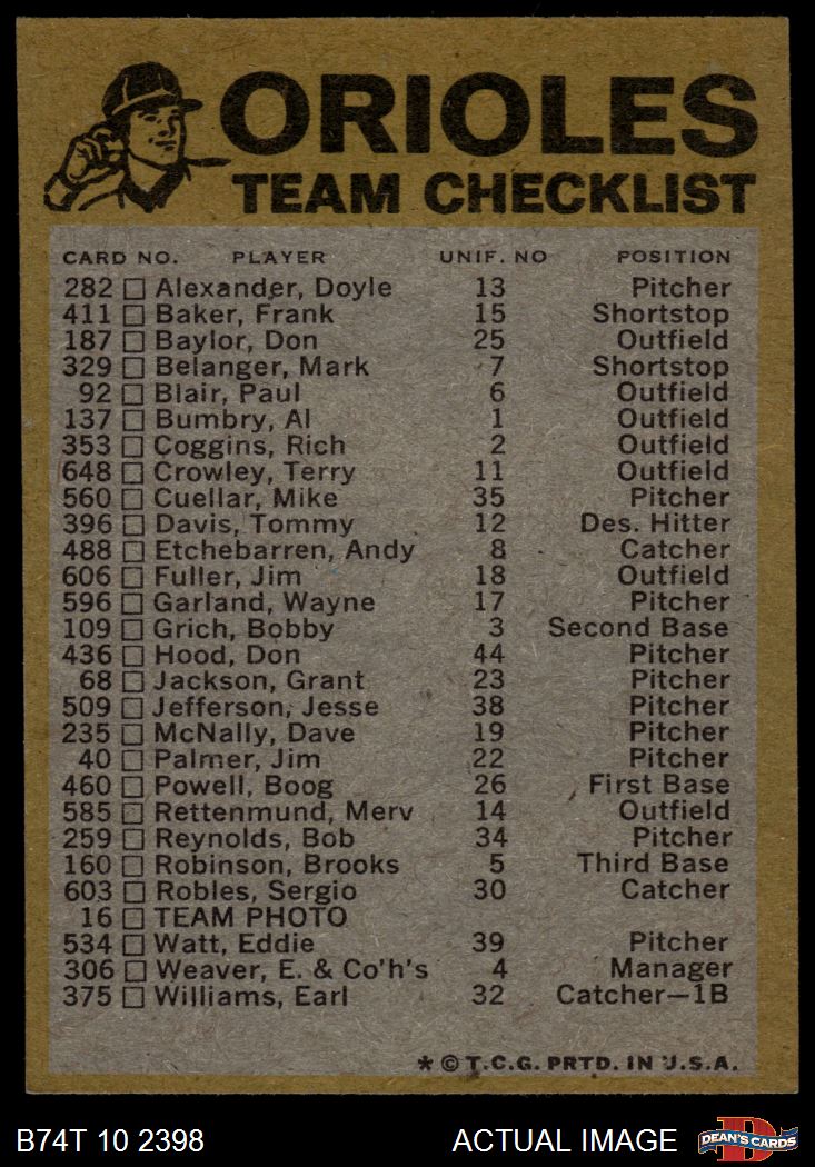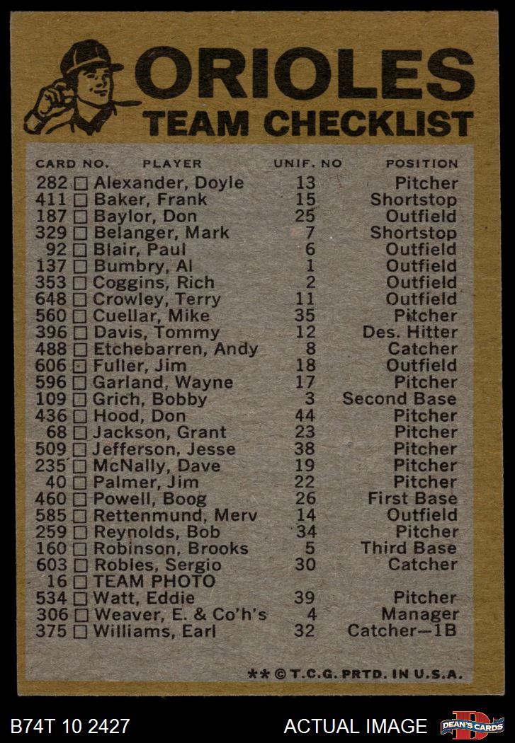 1974 Topps Baseball Cards (16,005 available)1974 Topps Red Team Checklist Orioles (21 available)