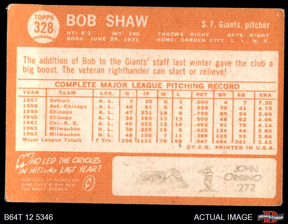 1964 Topps #328 Bob Shaw 2 - GOOD