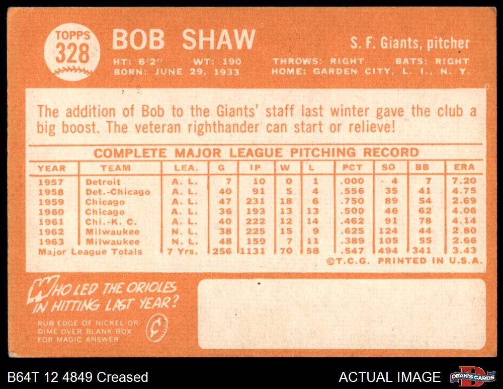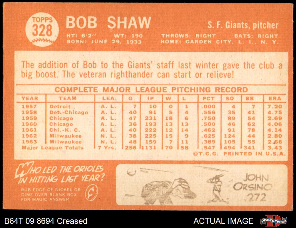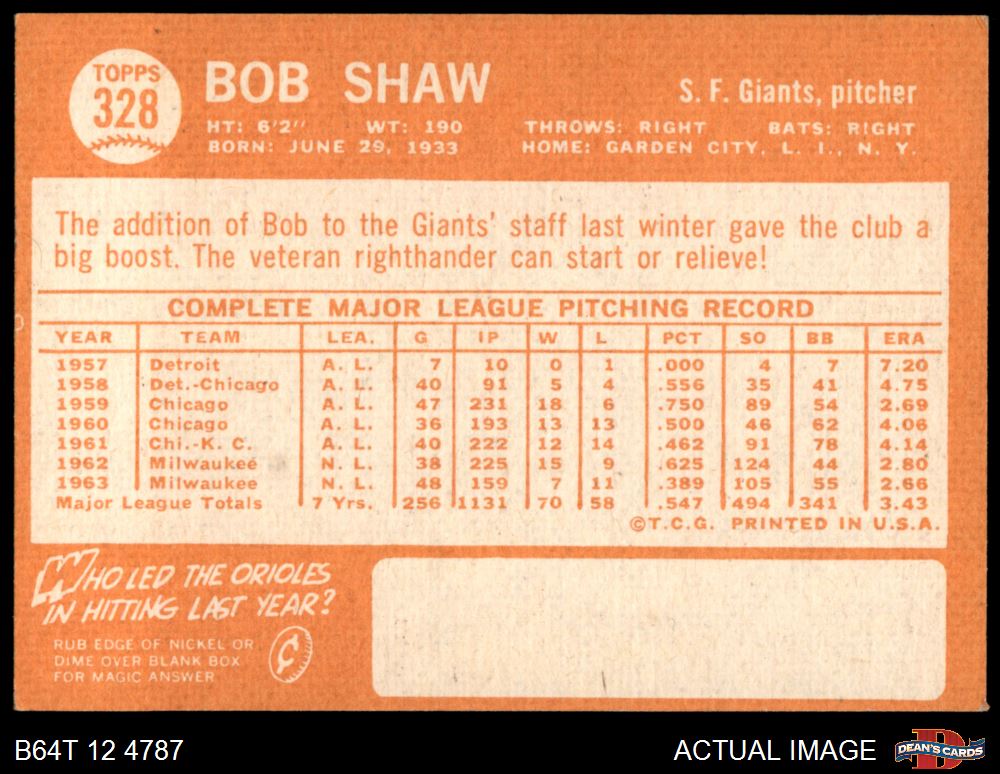 1964 Topps #328 Bob Shaw 3 - VG
