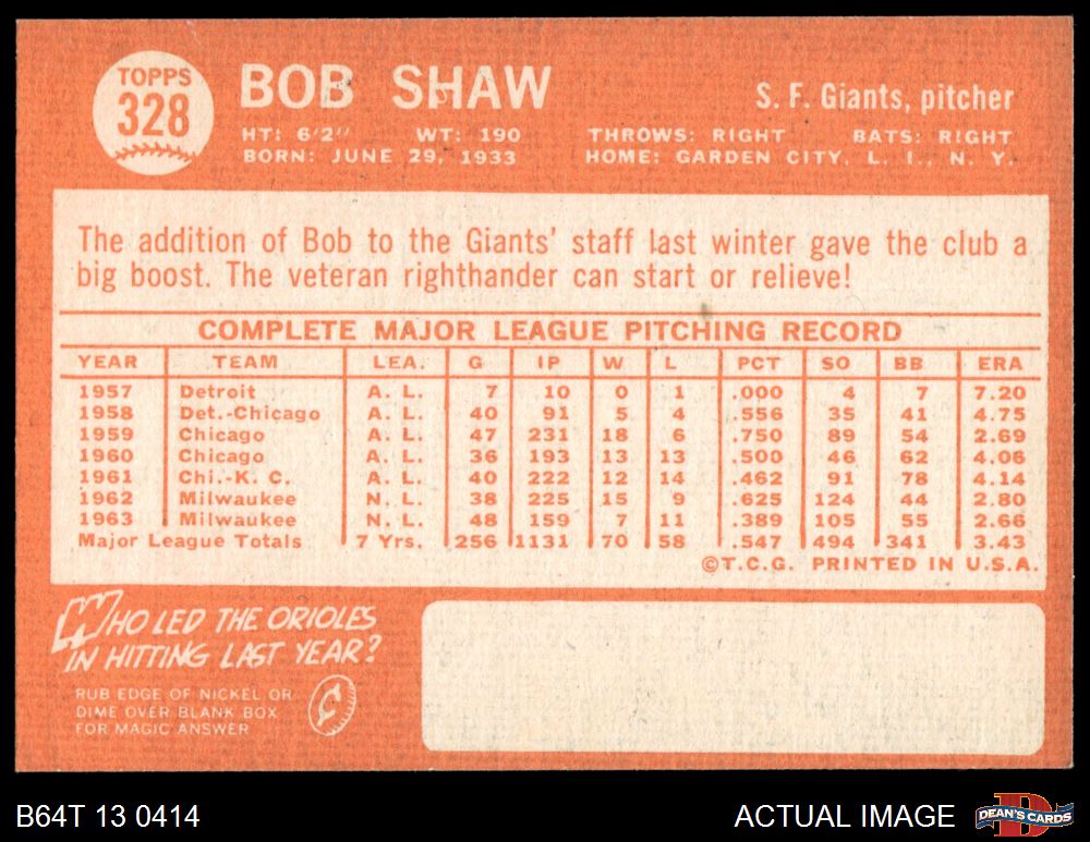 1964 Topps #328 Bob Shaw 7 - NM